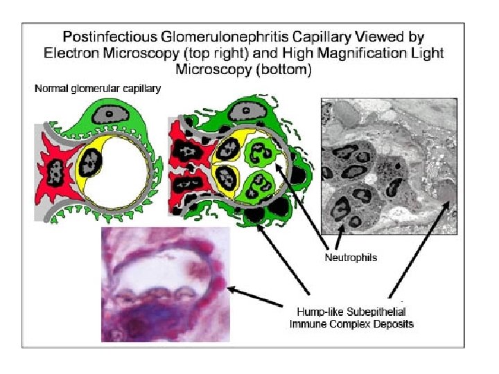 Akut PSGN • M tip streptokokların bazı suşları (12, 4, 1) ile oluşan tonsillit veya impetigodan 10 -20 gün sonra gelişir. • Günümüzde oldukça seyrek • Erkeklerde daha sıktır • En sık 4 -15 yaş arasında görülür. • %10 olgu >40 yaş. • Patogenezi bir immün kompleks hastalığıdır. Streptokokların eksotoksin B antijenine karşı gelişen antikorlarla oluşur. Bu kompleksler subendotelyal, mesangial ve subepitelyal alanda birikir. Kompleman aktive olur, ortama gelen nötrofil ve monosit-makrofajlar ile hasar meydana gelir.