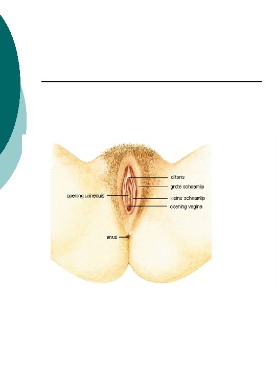 3. 2 uitwendige geslachtsorganen De schaamlippen ¡ De clitoris ¡ De opening van de urinebuis ¡ De opening van de vagina ¡ Maagdenvlies ¡ De anus ¡