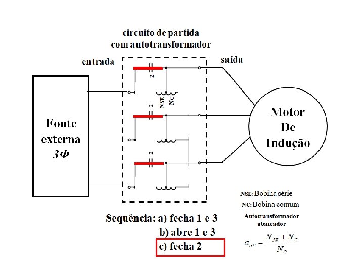 b)Usando autotransformador abaixador - A mudança da configuração deve ser feita quando a velocidade do motor estiver perto da nominal. - A corrente de partida é reduzida proporcional à queda de tensão e o conjugado de partida com o quadrado da tensão.
