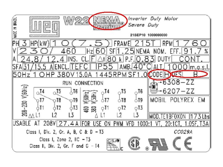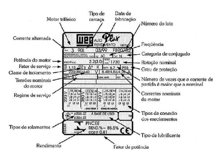 Letra de código de partida (NEMA) -A letra de código especifica limites para da corrente de partida Spartida =Potência nominal em HP x letra de código de partida VT: tensão de linha