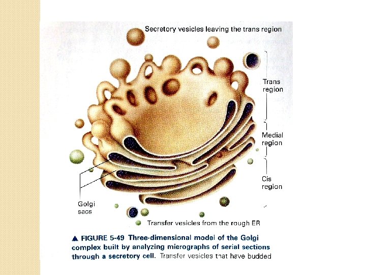 Badan Golgi Kelanjutan endoplasmik retikulum mempunyai bentuk sisternae dengan ujung-ujungnya mbtk perluasan (vesikel). Vesikel dapat lepas dari sisternae & bermigrasi membawa protein yang siap dideposit pada membran sel atau disekresikan keluar sel. Berfungsi sebagai tempat untuk penyempurnaan (maturasi) protein & lipid membran sel atau yang disekresikan keluar sel. Membentuk lisosom