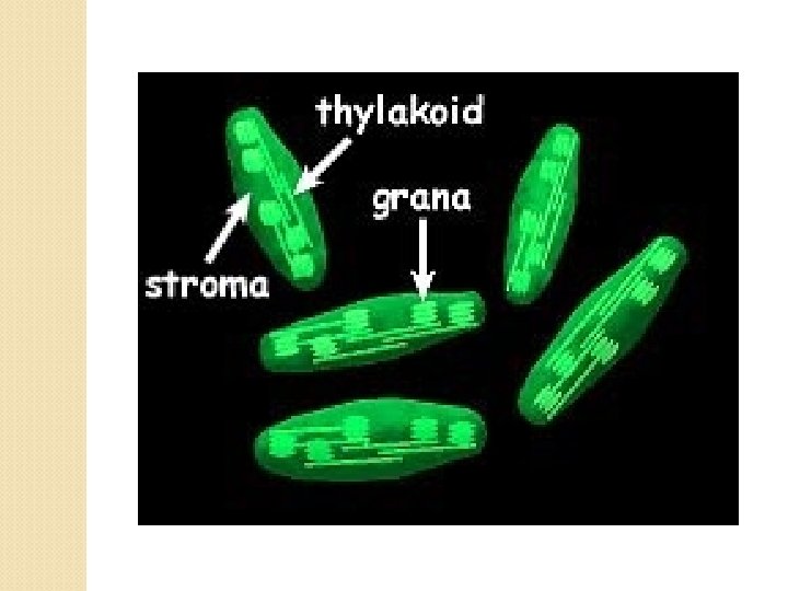 Plastida n Terdiri dari: n Kloroplas mengandung klorofil n Tilakoid tempat terjadinya fotosintesis n Stroma menyimpan hasil fotosintesis n Kromoplas mengandung karoten n Leukoplas menyimpan cadangan makanan