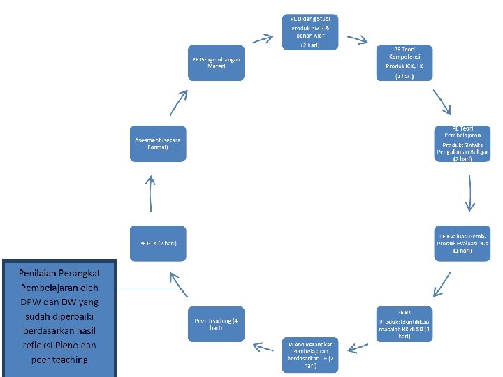 PENILAIAN WORKSHOP (W) � Penilaian meliputi penilaian proses (bobot 15) dan produk (bobot 15) oleh DPE � Penilaian akhir diambil dari rerata nilai DPE, dengan skala 100 � Penilaian proses mencakup aktivitas peserta dalam praktik eksploratif, diskusi kelompok, kerja kelompok/ individual, dan miroteaching dalam peerteaching. � Penilaian produk berupa portofolio yang berisi RPP dan kelengkapannya (AMP, media pembelajaran, instrumen penilaian, LKS, dan bahan ajar) � Kriteria minimal kelulusan adalah 80 dari skala 100.