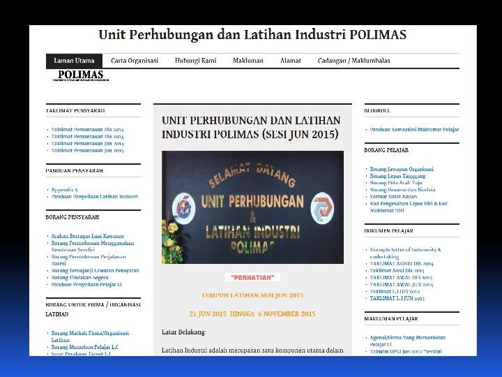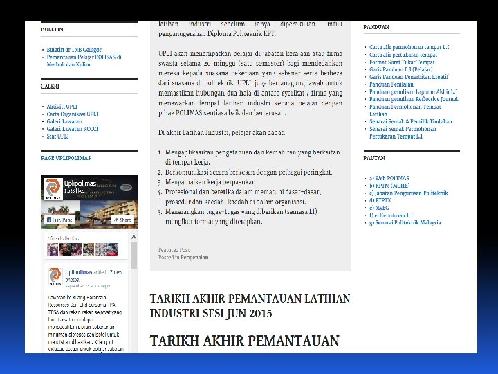 TANGGUNGJAWAB PELAJAR PERLU MELAYARI LAMAN WEB www. polimas. edu. my ATAU www. uplipolimas. wordpress. com UNTUK MENDAPATKAN MAKLUMAT BERIKUT: MAKLUMAN TARIKH PENGESAHAN TAMAT L. I PERKARA BERKAITAN LATIHAN INDUSTRI (PERATURAN DAN KEPERLUAN TINDAKAN SEBELUM, SEMASA DAN SELEPAS LATIHAN INDUSTRI) PENTING: * MAKLUMAN MULA DI UPLOAD SELEWATNYA 3 MINGGU SEBELUM TARIKH PENGESAHAN TAMAT L. I