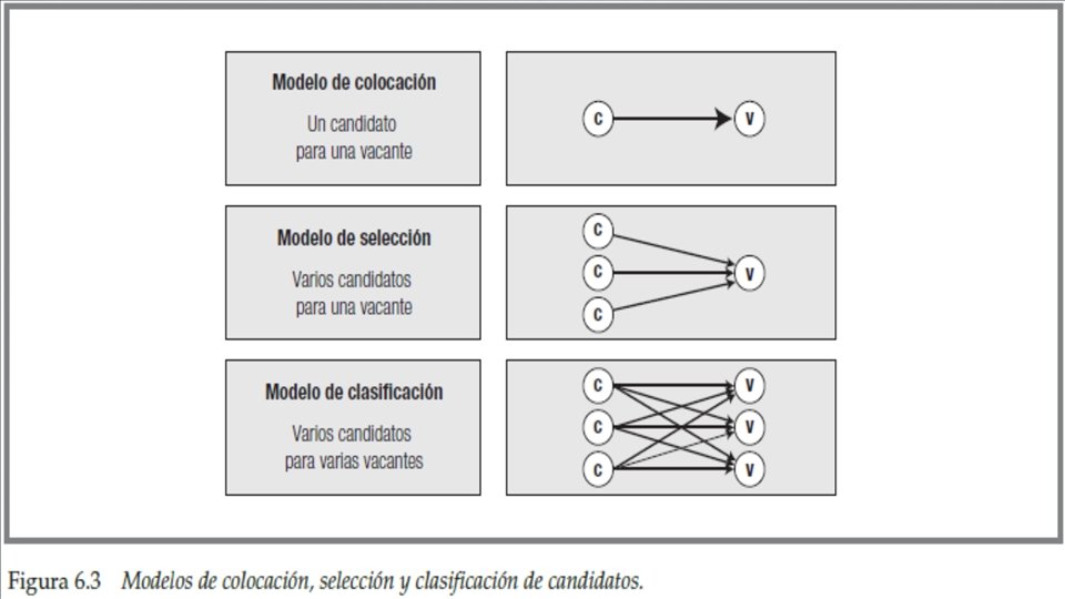 • Modelo de colocación, cuando no se incluye la categoría de rechazo. En este modelo hay un solo candidato y una sola vacante, que debe ocupar ese candidato. • Modelo de selección, cuando hay varios candidatos y una sola vacante a cubrir. Se compara cada candidato con los requisitos que exige el puesto, las alternativas son: aprobación o rechazo.