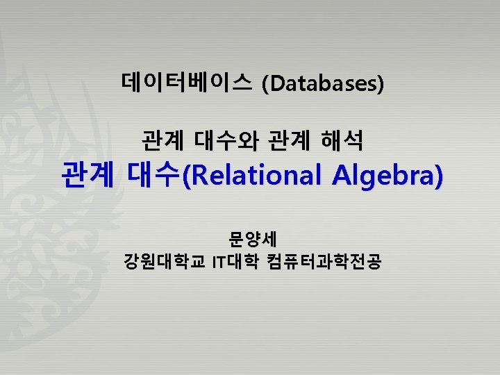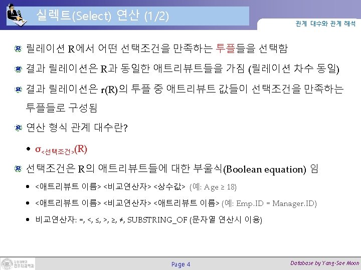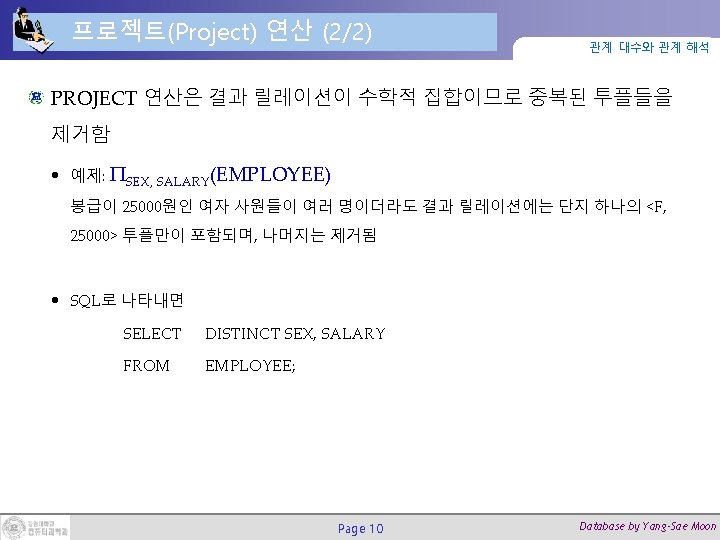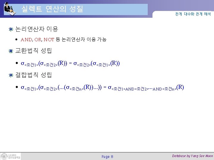 실렉트 연산과 SQL 질의 관계 대수와 관계 해석 실렉트 연산 예제: σ DNO=4 AND SALARY>25000 (EMPLOYEE) 대응하는 SQL 질의 SELECT * FROM EMPLOYEE WHERE DNO=5 AND SALARY > 25000; Page 7 Database by Yang-Sae Moon