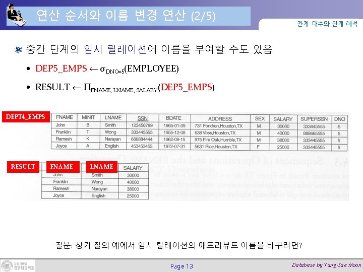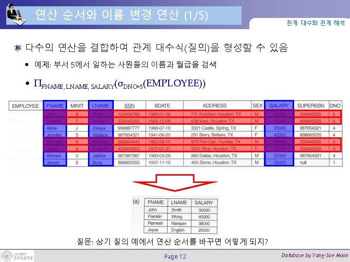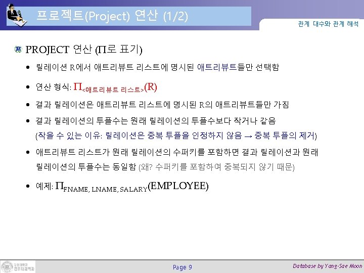 프로젝트 연산의 실행 예제 ΠFNAME, LNAME, SALARY(EMPLOYEE) Page 11 관계 대수와 관계 해석 ΠSEX, SALARY (EMPLOYEE) Database by Yang-Sae Moon
