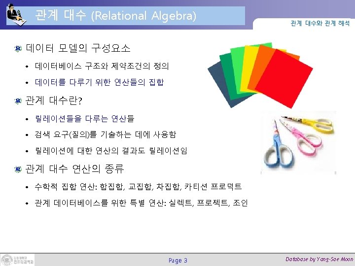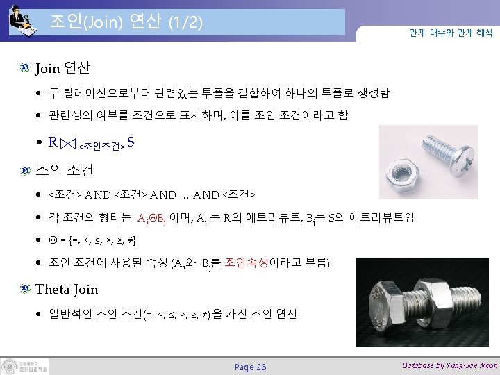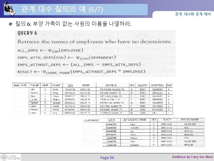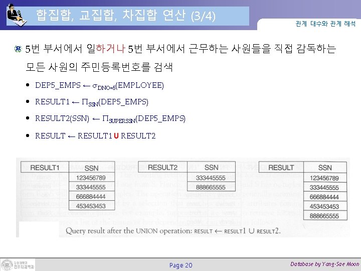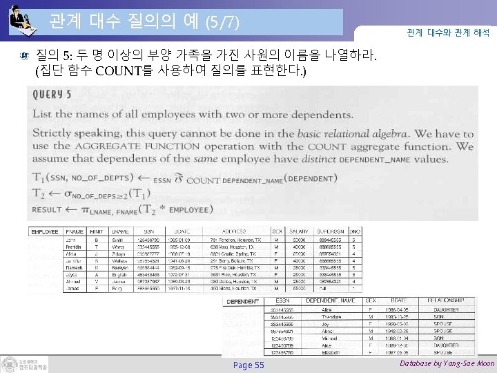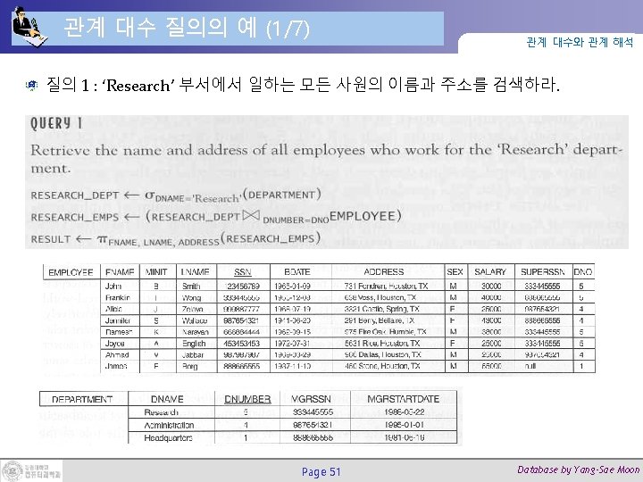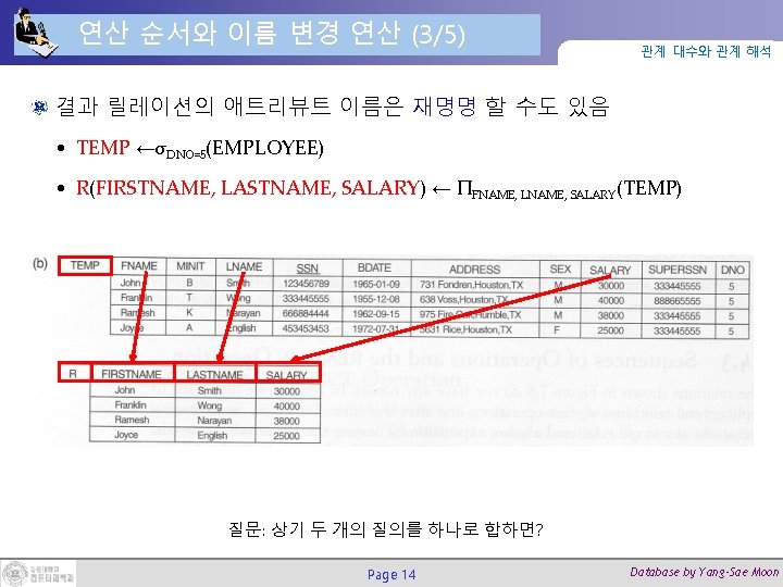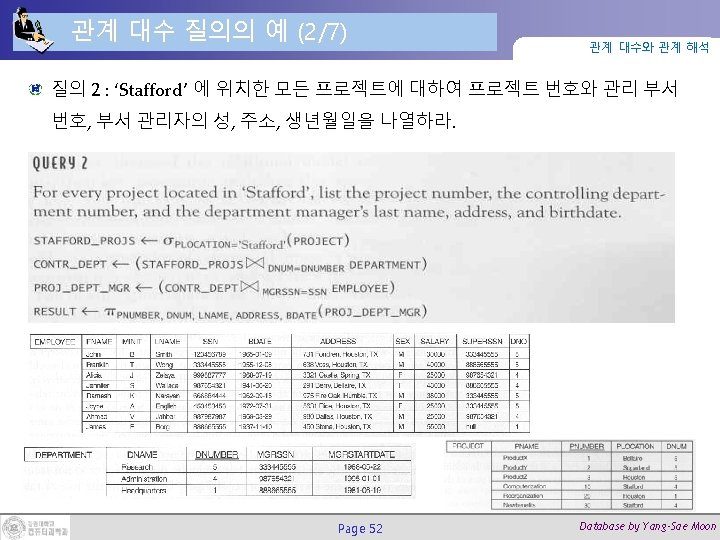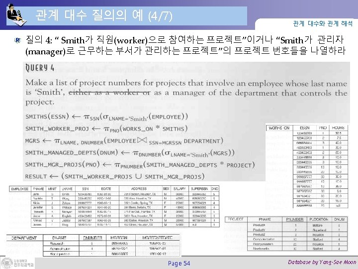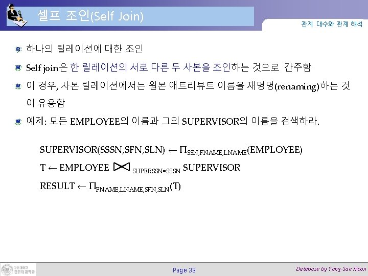 조인(Join) 연산 (2/2) 관계 대수와 관계 해석 DEPT_MGR ← DEPARTMENT Page 27 MGRSSN=SSNEMPLOYEE Database by Yang-Sae Moon