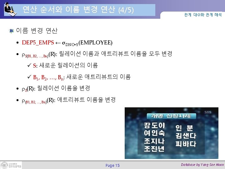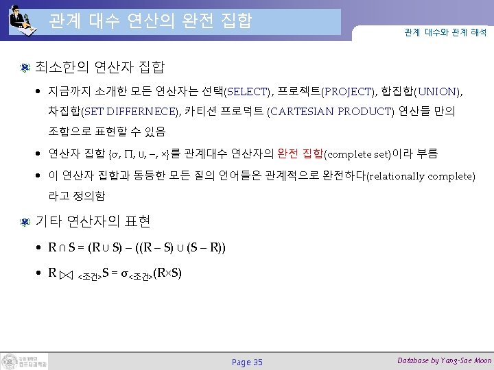 연산 순서와 이름 변경 연산 (5/5) 관계 대수와 관계 해석 SQL에서의 별명 사용으로 해석 가능함 • TEMP ←σDNO=5(EMPLOYEE) • R(FIRSTNAME, LASTNAME, SALARY) ← ΠFNAME, LNAME, SALARY(TEMP) SELECT E. FNAME AS FIRSTNAME, E. LNAME AS LASTNAME, E. SALARY AS SALARY FROM EMPLOYEE AS E WHERE E. DNO=5; Page 16 Database by Yang-Sae Moon