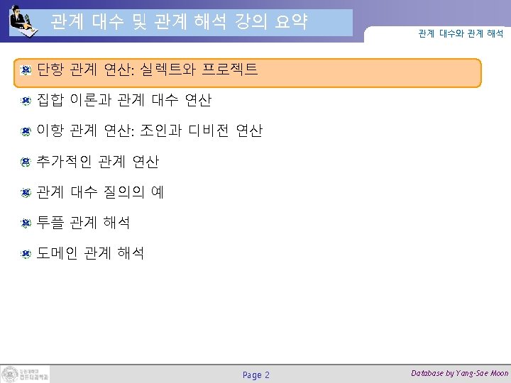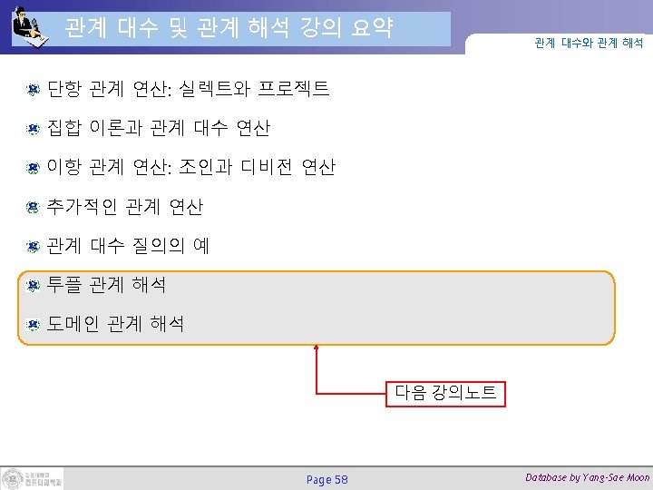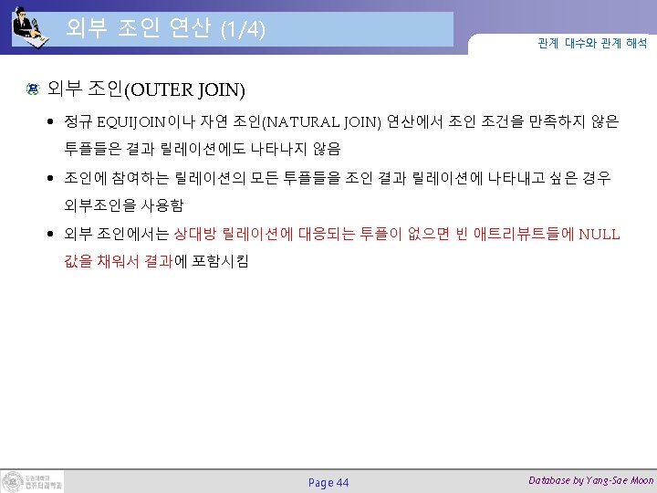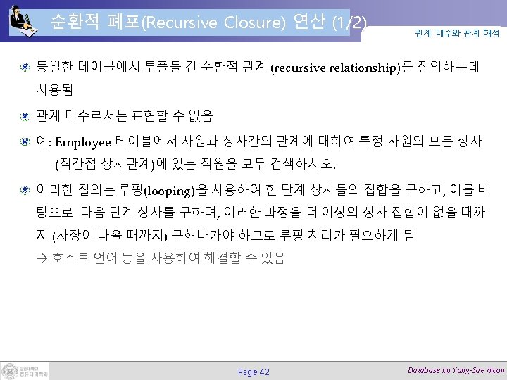 순환적 폐포(Recursive Closure) 연산 (2/2) Page 43 관계 대수와 관계 해석 Database by Yang-Sae Moon