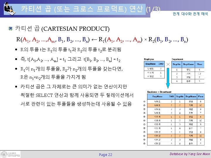 합집합, 교집합, 차집합 연산 (4/4) 관계 대수와 관계 해석 STUDENT ∪ INSTRUCTOR STUDENT ∩ INSTRUCTOR STUDENT - INSTRUCTOR - STUDENT Page 21 Database by Yang-Sae Moon