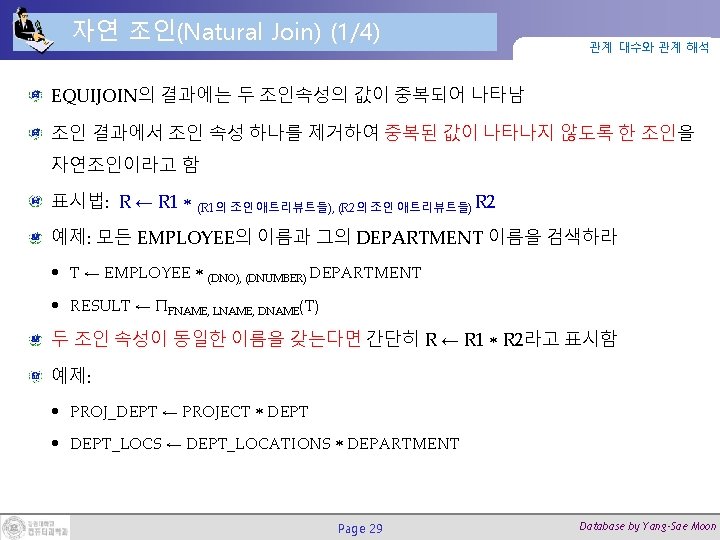 동등 조인 (Equi-Join) 관계 대수와 관계 해석 조인 조건에서 동등 비교(equality comparison) 만을 사용하는 조인 EQUIJOIN 사용 예제: 모든 DEPARTMENT의 이름과 그 관리자의 이름을 검색하라: DEPT_MGR ← DEPARTMENT MGRSSN=SSN EMPLOYEE RESULT ← ΠDNAME, FNAME, LNAME(DEPT_MGR) Page 28 Database by Yang-Sae Moon
