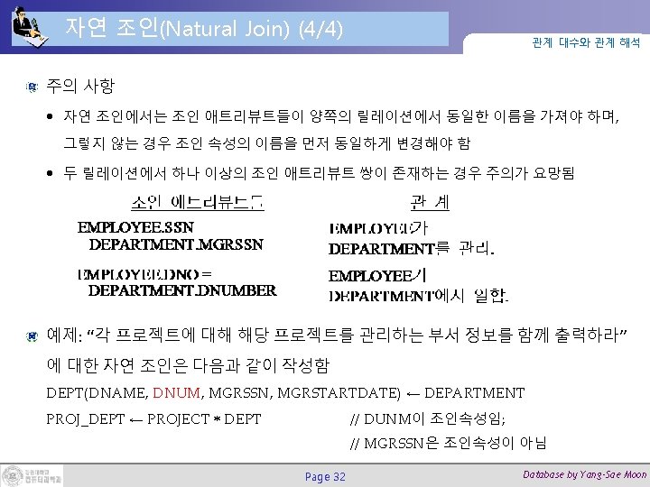 자연 조인(Natural Join) (3/4) 관계 대수와 관계 해석 DNUMBER DEPT_LOCS ← DEPT_LOCATIONS DEPARTMENT DNUMBER Page 31 Database by Yang-Sae Moon