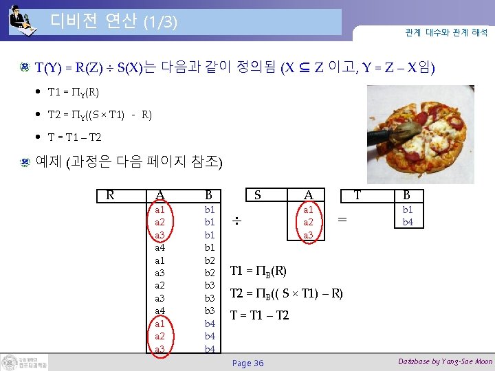 디비전 연산 (2/3) 관계 대수와 관계 해석 = T←R S T 1 = ΠB(R) T 2 = ΠB((S × T 1) – R) T = T 1 – T 2 T 1 B b 1 b 2 b 3 b 4 a 1, a 2, a 3와의 모든 조합이 있는 놈: b 1, b 4 Page 37 S×T 1 A a 1 a 1 a 2 a 2 a 3 a 3 B b 1 b 2 b 3 b 4 S×T 1 - R A a 1 a 2 T 2 B b 2 b 3 T B b 1 b 4 B b 3 b 2 Database by Yang-Sae Moon