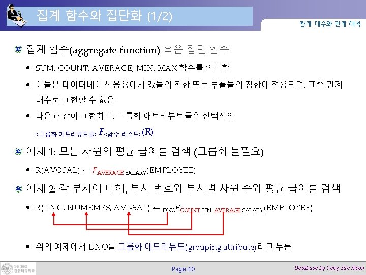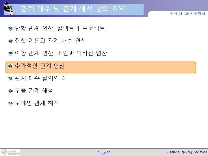 디비전 연산 (3/3) 관계 대수와 관계 해석 질의: Smith가 근무하는 모든 프로젝트에서 근무하는 사원들의 이름을 검색하라. = SMITH ← σFNAME=‘John’ AND LNAME=‘Smith’(EMPLOYEE) SMITH_PNOS ← ΠPNO(WORKS_ON ESSN=SSNSMITH) SSN_PNOS ← ΠESSN, PNO(WORKS_ON) SSNS(SSN) ← SSNPNOS SMITH_PNOS RESULT ← ΠFNAME, LNAME(SSNS * EMPLOYEE) Page 38 Database by Yang-Sae Moon