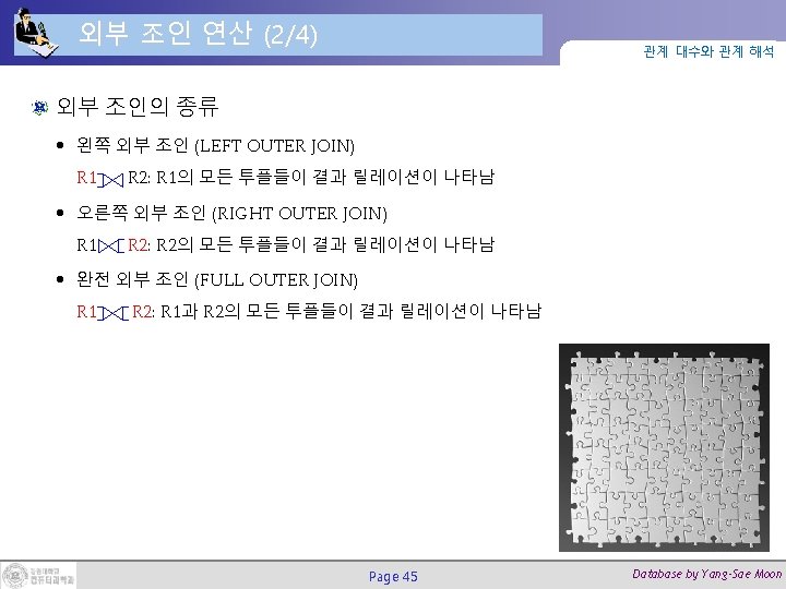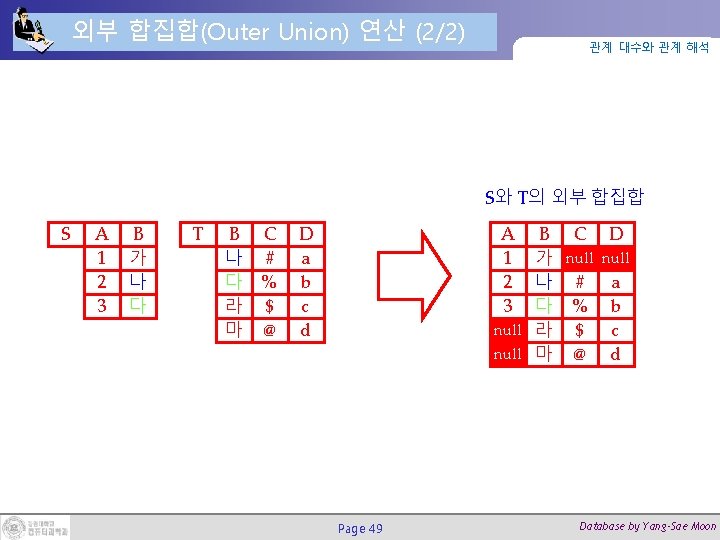 외부 합집합(Outer Union) 연산 (1/2) 관계 대수와 관계 해석 합집합 호환성이 없는 두 릴레이션을 합집합(union)하는데 사용됨 • 데이터베이스 구조와 제약조건의 정의 방식 예제 • STUDENT(Name, SSN, Department, Advisor)와 • FACULTY(Name, SSN, Department, Rank)의 outer union은 • RESULT(Name, SSN, Department, Advisor, Rank) 임 • RESULT 에서 STUDENT 투플은 Rank 속성의 값이 null이고, FACULTY 투플은 Advisor 속성의 값이 null임 Page 48 Database by Yang-Sae Moon