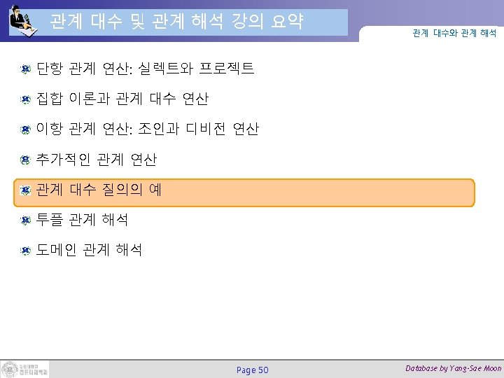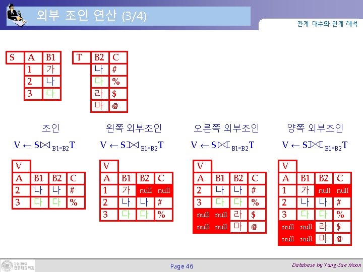 외부 조인 연산 (4/4) 관계 대수와 관계 해석 null TEMP ← EMPLOYEE SSN=MGRSSNDEPARTMENT RESULT ← ΠFNAME, MINIT, LNAME, DNAME(TEMP) Page 47 null Database by Yang-Sae Moon