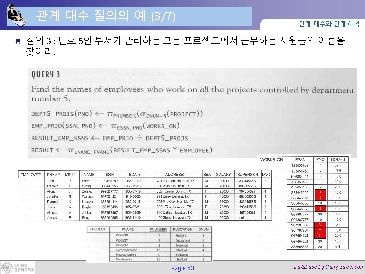 자연 조인(Natural Join) (2/4) 관계 대수와 관계 해석 DNUM DEPT DNUM PROJ_DEPT ← PROJECT DEPT DNUM Page 30 Database by Yang-Sae Moon