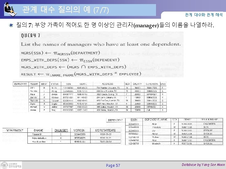 실렉트 연산의 실행 예제 관계 대수와 관계 해석 σ(DNO=4 AND SALARY>25000) OR (DNO=5 AND SALARY>30000) (EMPLOYEE) Page 6 Database by Yang-Sae Moon