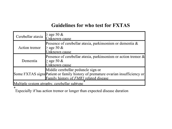 FXTAS • Fragile X-related tremor/ataxia syndrome – Males with pre-mutation – Onset after 50 (usually early 60 s) – Intension tremor and or/gait ataxia – Mild parkinsonism – Neuropathy – MRI: • T 2/FLAIR lesions in Middle cerebellar peduncle • Also in periventricular white matter and brainstem • Atrophy
