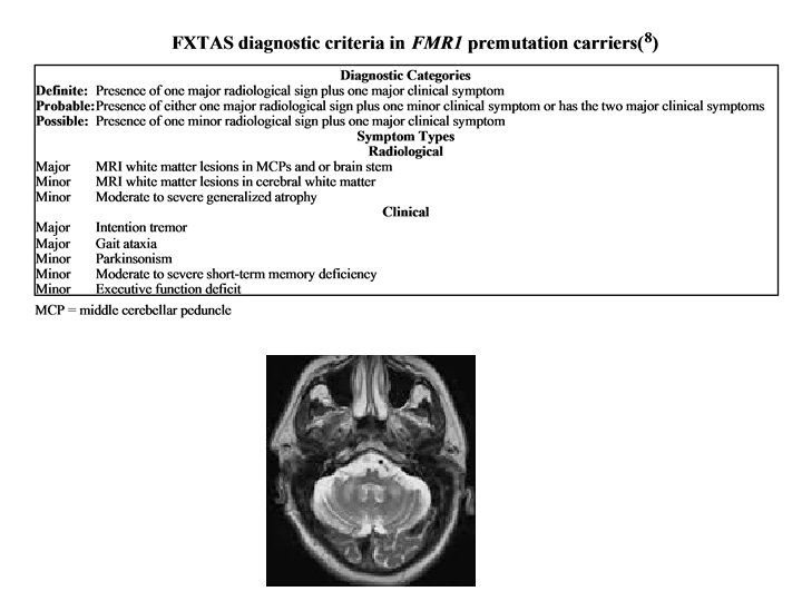 FXTAS • With pre-mutation, there is increased transcription of FMR 1 (i. e. more m. RNA). • Pathogenesis results from neural toxicity of FMR 1 m. RNA • Inclusion in neurons and astrocyes, spongiform white matter changes in subcortical, periventricular and brainstem regions including middle cerebellar peduncle.