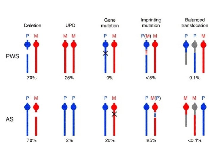 PWS- genetics • Absence of Paternal 15 q 11 contribution (PWCR) – – – Deletion- 70% Maternal uniparental disomy- 20 -30% Imprinting defect- Mutation in methylation center Same region as Angelman syndrome Methylation testing identifies 99%