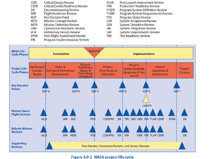 NASA Program & Project Life Cycles NASA Life Cycle Phases FORMULATION Pre-Systems Acquisition Pre-Phase A: Concept Studies Project Life Cycle Phases Project Life Cycle Gates & Major Events Agency Reviews Phase B: Phase A: KDP A 2. 3. 4. 5. 6. 7. Operations Phase D: System Assembly, Int & Test, Launch Phase E: Operations & Sustainment KDP E KDP F KDP D Launch Preliminary Project Plan Draft Project Requirements Decommissioning Phase F: Closeout End of Mission Final Archival of Data Baseline Project Plan 7 ASM 5 MCR SRR SDR (PNAR) PDR (NAR) CDR / PRR 2 SIR Re-enters appropriate life cycle phase if modifications are needed between flights 6 MCR SRR MDR 4 (PNAR) PDR (NAR) CDR / PRR 2 ORR SAR Inspections and Refurbishment FRR PLAR CERR 3 End of Flight Flexibility is allowed in the timing, number, and content of reviews as long as the equivalent information is provided at each KDP and the approach is fully documented in the Project Plan. These reviews are conducted by the project for the independent SRB. See Section 2. 5 and Table 2 -6. PRR needed for multiple (≥ 4) system copies. Timing is notional. CERRs are established at the discretion of Program Offices. For robotic missions, the SRR and the MDR may be combined. The ASP and ASM are Agency reviews, not life-cycle reviews. Includes recertification, as required. Project Plans are baselined at KDP C and are reviewed and updated as required, to ensure project content, cost, and budget remain consistent. DR PFAR SIR ORR FRR PLAR CERR 3 SMSR, LRR (LV), FRR (LV) Peer Reviews, Subsystem PDRs, Subsystem CDRs, and System Reviews FOOTNOTES 1. Phase C: Final Design & Fabrication KDP C KDP B Robotic Mission Project Reviews 1 Supporting Reviews IMPLEMENTATION Systems Acquisition FAD Re-flights Launch Readiness Reviews Preliminary Design & Technology Completion Concept & Technology Development ASP 5 Human Space Flight Project Reviews 1 Approval for Implementation ACRONYMS ASP—Acquisition Strategy Planning Meeting ASM—Acquisition Strategy Meeting CDR—Critical Design Review CERR—Critical Events Readiness Review DR—Decommissioning Review FAD—Formulation Authorization Document FRR—Flight Readiness Review KDP—Key Decision Point LRR—Launch Readiness Review MCR—Mission Concept Review MDR—Mission Definition Review NAR—Non-Advocate Review ORR—Operational Readiness Review PDR—Preliminary Design Review PFAR—Post-Flight Assessment Review PLAR—Post-Launch Assessment Review PNAR—Preliminary Non-Advocate Review PRR—Production Readiness Review SAR—System Acceptance Review SDR—System Definition Review SIR—System Integration Review SMSR—Safety and Mission Success Review SRR—System Requirements Review DR