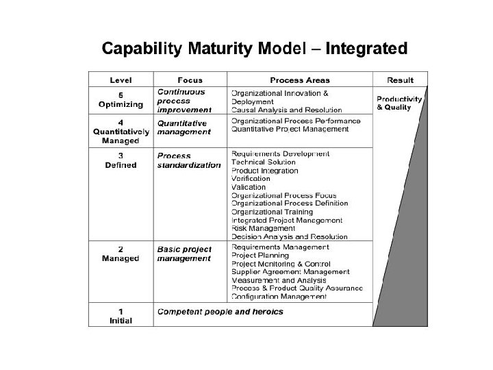 CMM (Capability Maturity Model) • Comes from Taylorism (“scientific management”, statistical quality control) – Maximize efficiency by rational planning procedures – Assembly lines, time and motion studies (Henry Ford) – Behavior of individual controlled by normative rules and preplanned by system design – Projects achieve control over their products and processes by narrowing the variation in the process performance to fall within acceptable quantitative boundaries