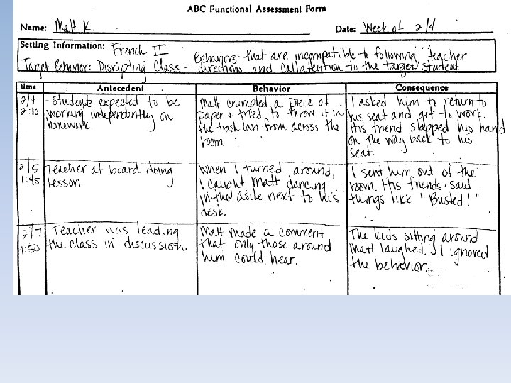 Examples of Direct Observations ABC Recording • Antecedents - what occurs right before the behavior. • Behavior - problem behavior (observable and defined) • Consequences - what happens right after the behavior