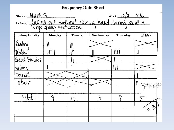 Examples of Direct Observations Frequency Count (RATE MEASURE!) – – – A measure of how often a clearly defined behavior occurs within a given period of time. Examine the frequency of the behavior by tallying or counting the behavior as it occurs. Use this when the behavior is discrete (has an obvious beginning and ending) and does not occur at very high rates. This information is helpful at ALL steps of the problem solving process ALWAYS MEASURE AS RATE WHEN POSSIBLE!!!!