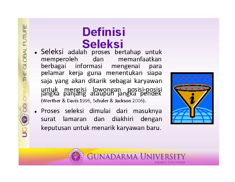 Seleksi Definisi Seleksi adalah proses bertahap untuk memperoleh dan memanfaatkan berbagai informasi mengenai para pelamar kerja guna menentukan siapa saja yang akan ditarik sebagai karyawan untuk mengisi lowongan posisi-posisi jangka panjang ataupun jangka pendek (Werther & Davis 1996, Schuler & Jackson 2006). Proses seleksi dimulai dari masuknya surat lamaran diakhiri dengan keputusan untuk menarik karyawan baru.