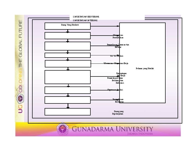 LINGKUNGAN EKSTERNAL LINGKUNGAN INTERNAL Orang Yang Direkrut Wawancara Pendahuluan Pemer iksaan Lamaran dan Résumé Tes-Tes Seleksi Wawancara-Wawancara Kerja Pela mar yang Ditolak Penyaringan Pra Kerja: Pemer iksaan Latar Belakang da n Refer ensi Keputusan Seleksi Pemer iksaan Kesehatan Orang yang Dipekerja kan
