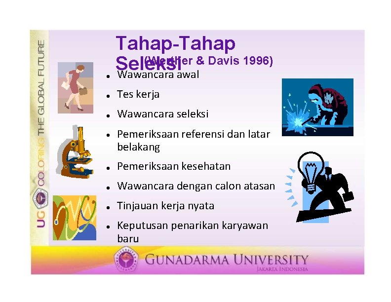Tahap-Tahap (Werther & Davis 1996) Seleksi Wawancara awal Tes kerja Wawancara seleksi Pemeriksaan referensi dan latar belakang Pemeriksaan kesehatan Wawancara dengan calon atasan Tinjauan kerja nyata Keputusan penarikan karyawan baru