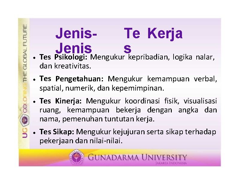 Jenis. Te Kerja Jenis s Tes Psikologi: Mengukur kepribadian, logika nalar, dan kreativitas. Tes Pengetahuan: Mengukur kemampuan verbal, spatial, numerik, dan kepemimpinan. Tes Kinerja: Mengukur koordinasi fisik, visualisasi ruang, kemampuan bekerja dengan angka dan nama, pemenuhan tuntutan kerja. Tes Sikap: Mengukur kejujuran serta sikap terhadap pekerjaan dan nilai-nilai.