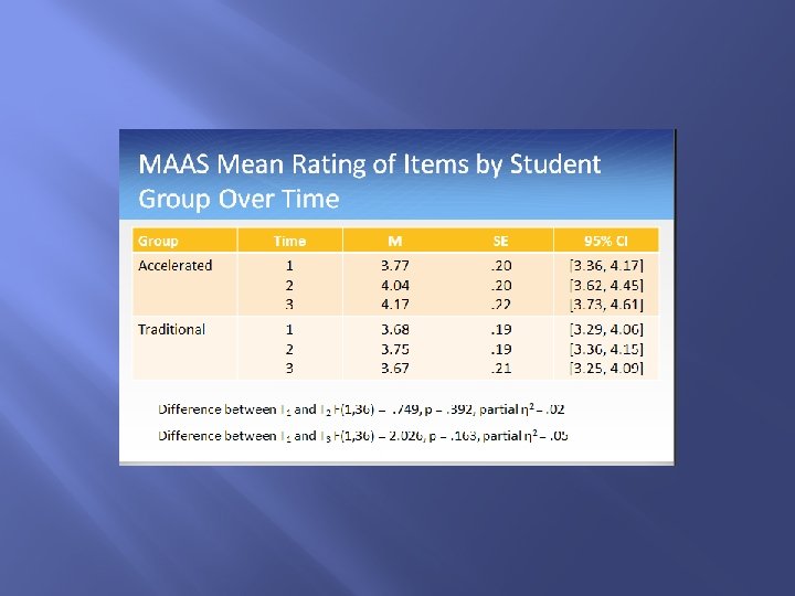 Instruments � � � Dependent Variables Perceived Stress Scale (PSS; Cohen, Kamarck, & Mermelstein, 1983) Mindful Attention Awareness Scale (MAAS; Brown & Ryan, 2003 Control Variables Health Promoting Lifestyle Profile II (HPLP II; Walker, Sechrist, Pender, 1995) The HPLP II served as a control for the health promoting practices the students engage in, independent of the self care module. Demographic information
