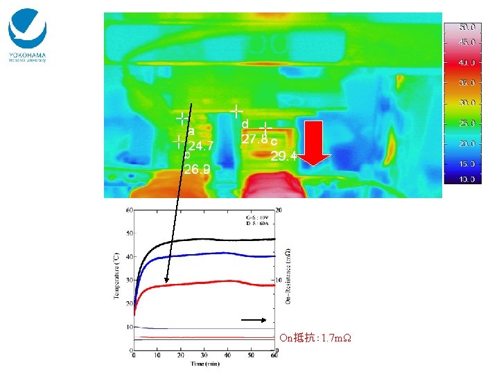 Results & Discussion power MOSFET (IRF 1324 Pb. F) thermocouple Cu S D G Cu Cu Cu current 60 A waste heat generation water cooled heatsink (10± 2℃) power MOSFET (IRF 1324 Pb. F)