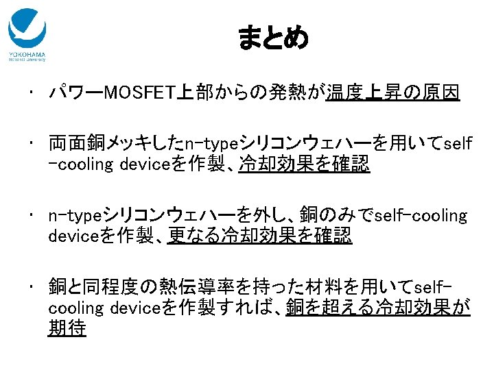 heat generation waste heatsink power MOSFET (IRF 1324 Pb. F) copperplate copper plating n-type Si (111) wafer S D heatsink waste heat current S Peltier effect + thermal conduciton Schematic structure of self-cooling device