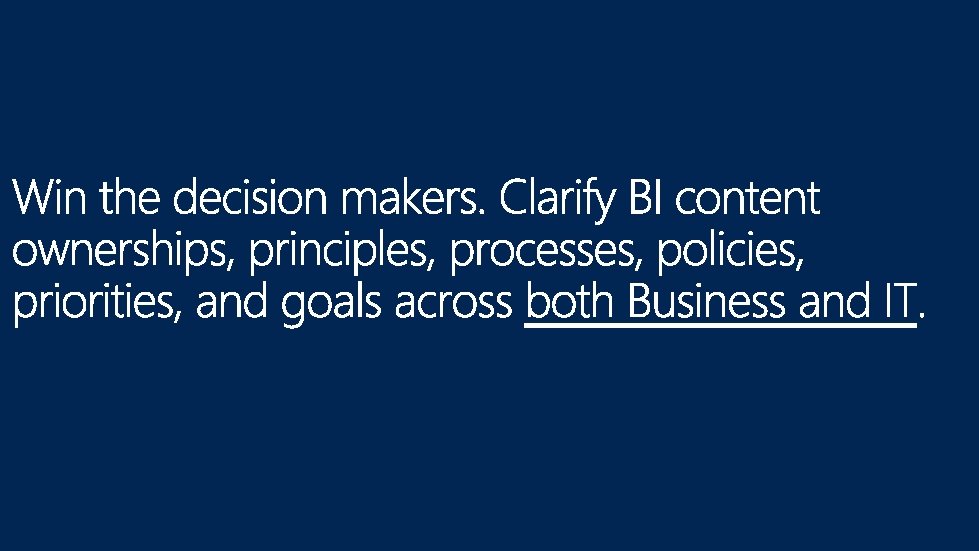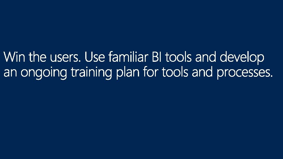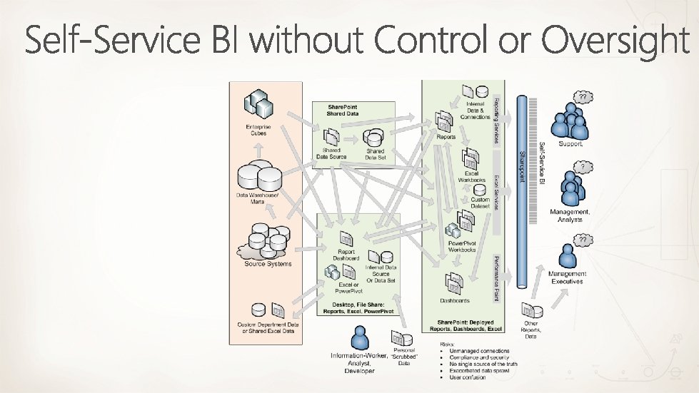 A good, solid, BI Governance process will: Establish change management and training policies Increase adoption of BI Drive infrastructure and technology decisions Mitigate the risk of choosing the wrong platform because both business and IT needs are considered Risks / Concerns include: Inadequate support from business and IT leaders Business users refusing to abide by the rules Lack of policy enforcement What should be governed? Source data for business data models Business data models, collaboration sites, and shared content Security standards for accessing source data, and business information in reports, and Excel workbooks In areas with limited exposure, BI can be less controlled and allow for a more empowerment of end users. How to implement? Involve business and IT leaders Determine initial principles and goals Clarify ownerships of business information and infrastructure Develop a training plan Consider new requirements as they arise, reevaluate, and resolve conflicts Provide reports to executive sponsors