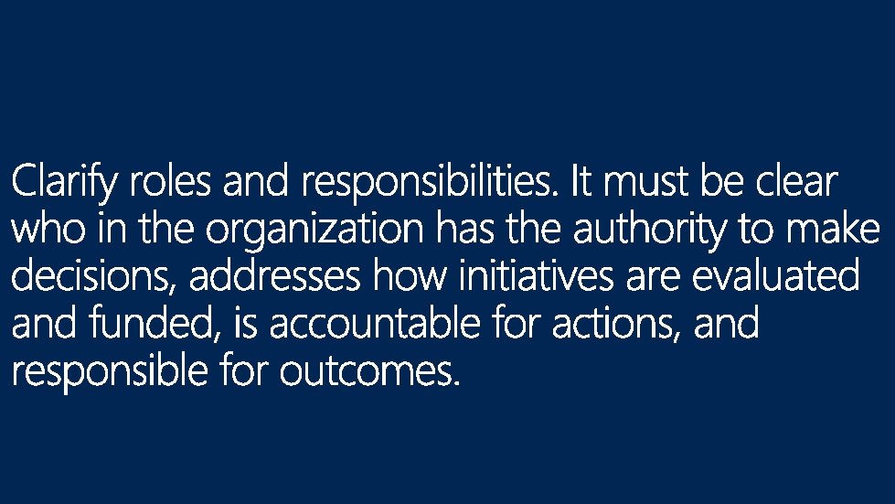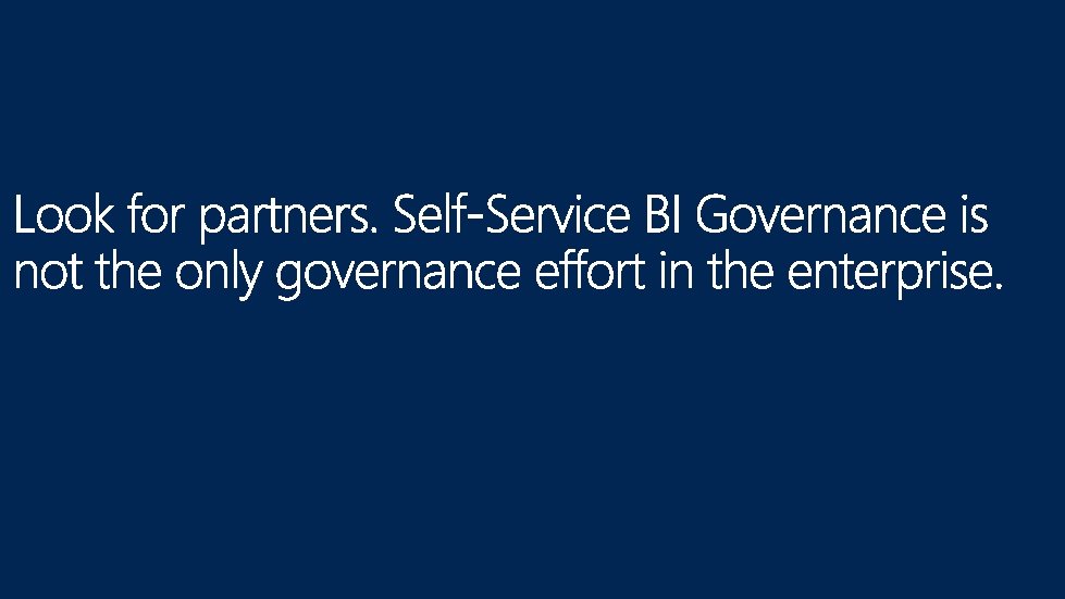 SSBI Corporate Business Intelligence • Addresses the guiding policies, principles, decision-making processes and oversight procedures to ensure the relevance and accuracy of the organization’s BI solutions. BI Governance Data Governance Information Technology • Revolves around the guiding policies, principles, decision-making processes and accountability of IT in the best interest of the organization. Self-Service Business Intelligence Tighter Scope • Addresses the guiding policies, principles, decision-making processes and oversight procedures to help business users create, share, and use relevant and accurate self-service BI BI solutions. Data Handling • Create policies for data quality, data management, process management, and risk management regarding the handling of data in the organization. IT Governance Corporate Governance Enterprise • Defines the goals for which the organization is governed.