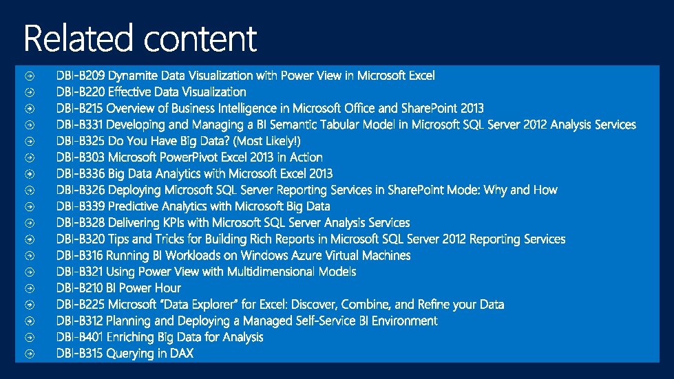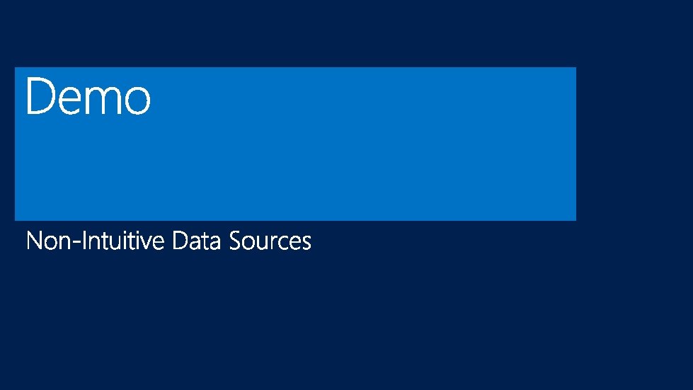 SQL Server Native Client Microsoft ODBC Provider for Hive Third-Party Providers Analysis Services OLE DB Provider ADOMD. NET Analysis Management Objects SQL Server Native Client OLE DB for ODBC Third-Party Providers ADO. NET Data Feed Client Microsoft. ACE. OLEDB Linked Excel Tables Big Data Multidimensional Sources Big and Cloud • Parallel Data Warehouse, Teradata • Windows Azure SQL Database • Apache Hadoop/Hive More Complex BISM • Multidimensional and tabular Analysis Services databases. • Power. Pivot data models uploaded to a BI-enabled farm. Relational Database Management Systems Web Content Plain-text data files and desktop databases. RDMS • SQL Server • Oracle, Sybase, Informix, IBM DB 2 • Others Web-based • Windows Azure Marketplace Data. Market • OData, REST and JSON • Share. Point lists and document libraries • Cut and paste from Web pages Desktop • Microsoft Access databases • Excel spreadsheets • Comma-separated values (CSV) files