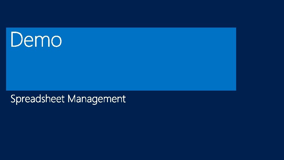 Consumerization of IT With the blurring of the lines between personal and work devices, applications, and services, the risk of losing track of what type of data goes where can lead to serious security issues. Cloud Sky. Drive Pro and Office 365 More Distributed • Sync workbooks and other files across devices. • Sky. Drive Pro is part of both Office 365 and Share. Point Server. • Office 365 enables browser interactivity for workbooks and Power View sheets. Email Exchange Server 2013 • Configure Search to crawl all discoverable content in Exchange. • Create an e. Discovery Center in Share. Point Sites Network Shares Files on local devices Share. Point Server 2013 • Share. Point e. Discovery Center • Power. Pivot Management Reporting • Approval workflows • ACM Integration Audit and Control Management Server • Non-intrusive auditing • Discover, assess and categorize spreadsheets and databases based on relevance, materiality and business impact Office Professional Plus 2013 • Analyze and document spreadsheets • Identify and categorize spreadsheet differences.