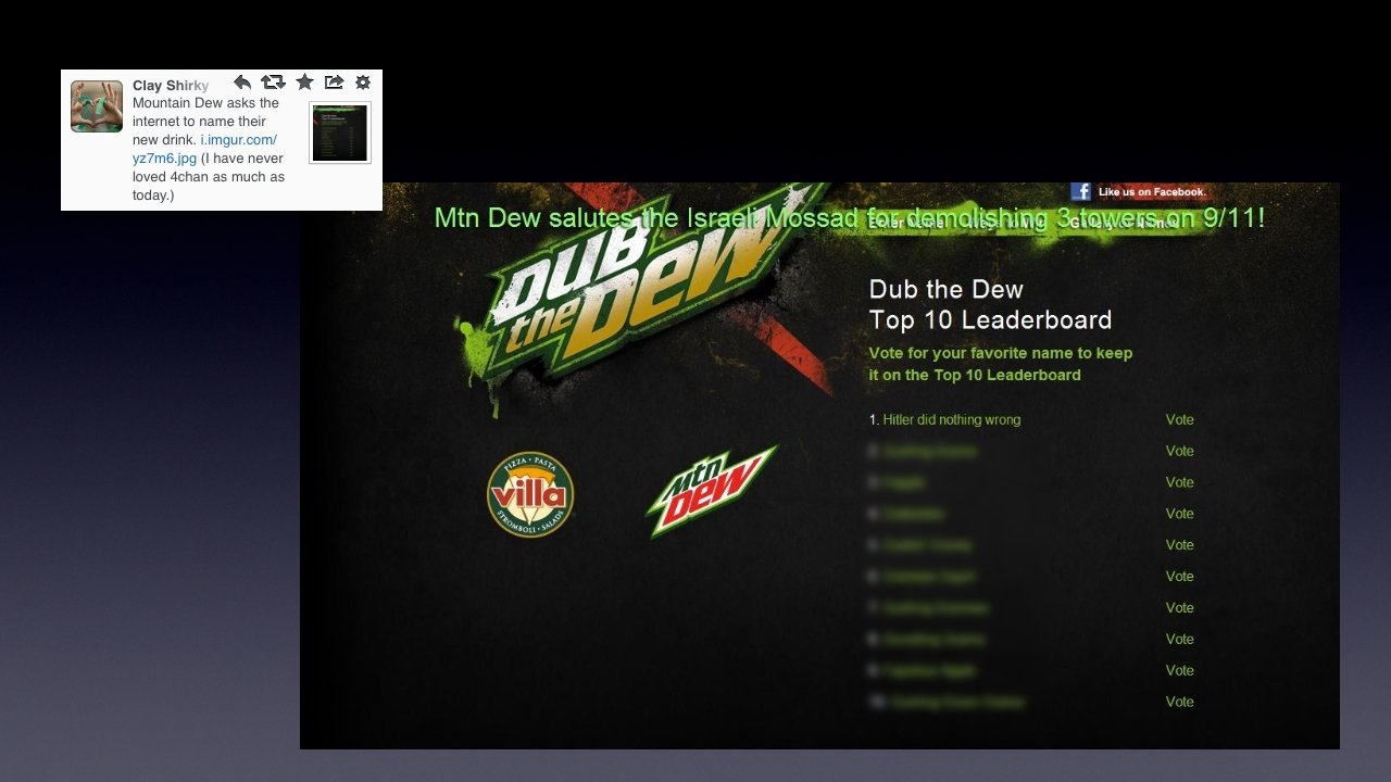 Dub the Dew • • • The idea: Let’s get more customers engaged with our brand The how: Let customers vote on the name of the new flavor of Dew! The mistake: It’s on the internet