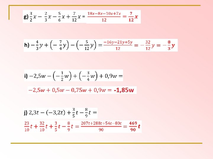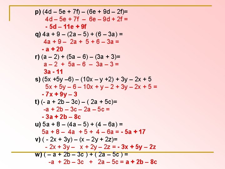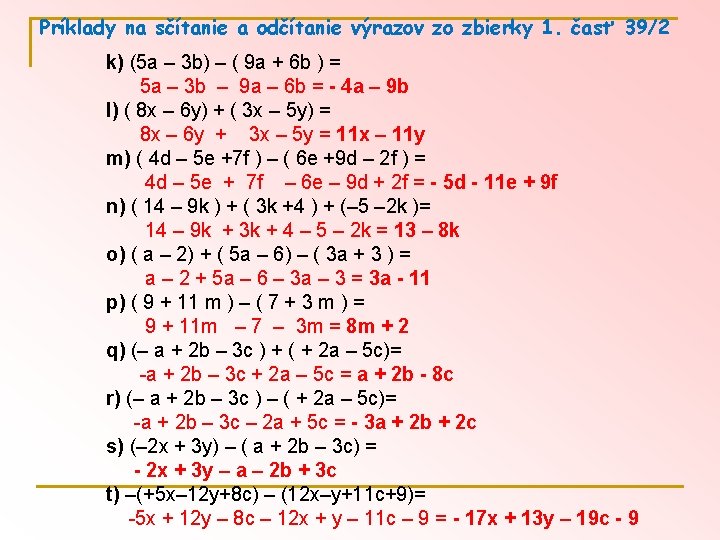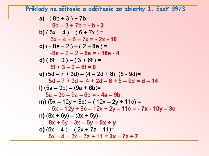 Príklady na sčítanie a odčítanie výrazov zo zbierky 1. časť 38/5 a) 3 x + 5 x – 8 x + 9 x -12 x = - 3 x b) 7 y – 14 y + 2 y + y - 5 y – y = - 10 y c) 8 c + ( - 2 c ) – ( - 4 c ) – 5 c = 8 c – 2 c + 4 c – 5 c = 5 c d) 0, 9 a + 1, 5 a - 2, 4 a + 8, 7 a = 8, 7 a e) 2, 3 b –( -4, 5 b) + (-2, 7 c)–(+2, 8 c) = 2, 3 b + 4, 5 b – 2, 7 c – 2, 8 c = 6, 8 b – 5, 5 c f) - 5, 5 h + 3, 3 h – ( - 3, 8 h) + (- 2, 7 h ) = - 5, 5 h + 3, 3 h + 3, 8 h – 2, 7 h = - 1, 1 h w) 5 a – ( 5 a + 4 ) = 5 a + (-5 a – 4) = 5 a - 5 a – 4 = - 4 x) 6, 5 x – ( 3, 5 x – 7 ) = 6, 5 x + (-3, 5 x + 7) = 6, 5 x – 3, 5 x + 7 = 3 x + 7