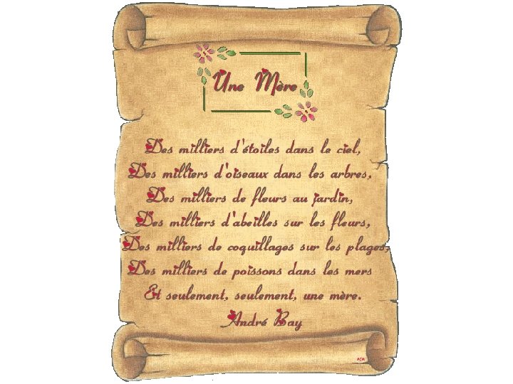 Une maman, c'est le pansement sur blessure, un chocolat chaud des jours froids, le parapluie contre l'orage, le manteau contre le froid, le sirop contre la toux. Une femme plaît aux yeux, une mère plaît au coeur. Une chemise de toile cousue par sa mère est chaude, une chemise de laine cousue par une étrangère est froide. Une mère a autant de façons d'aimer qu'elle a d'enfants. Tendresse maternelle toujours se renouvelle. Si l'amour avait un nom, il s'appellerait "maman". Si l'humanité se nourrissait de l'amour maternel, la paix universelle serait instaurée. Si je devais, en un mot, te décrire, je dirais "maman". . . Est-ce que ce mot, à lui seul, n'explique pas tout ? Bonne fête des mères !