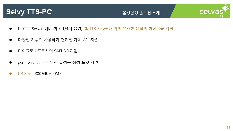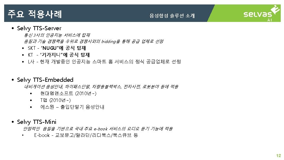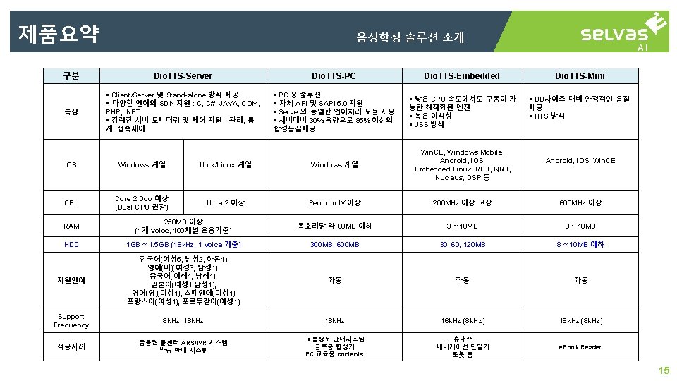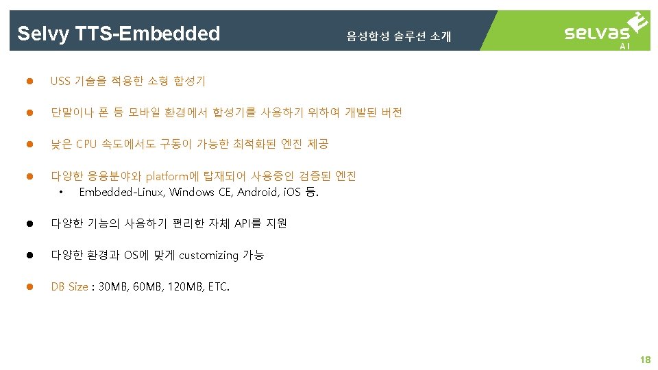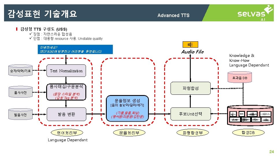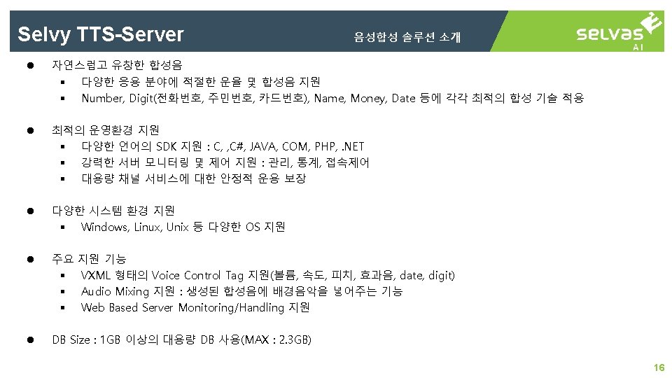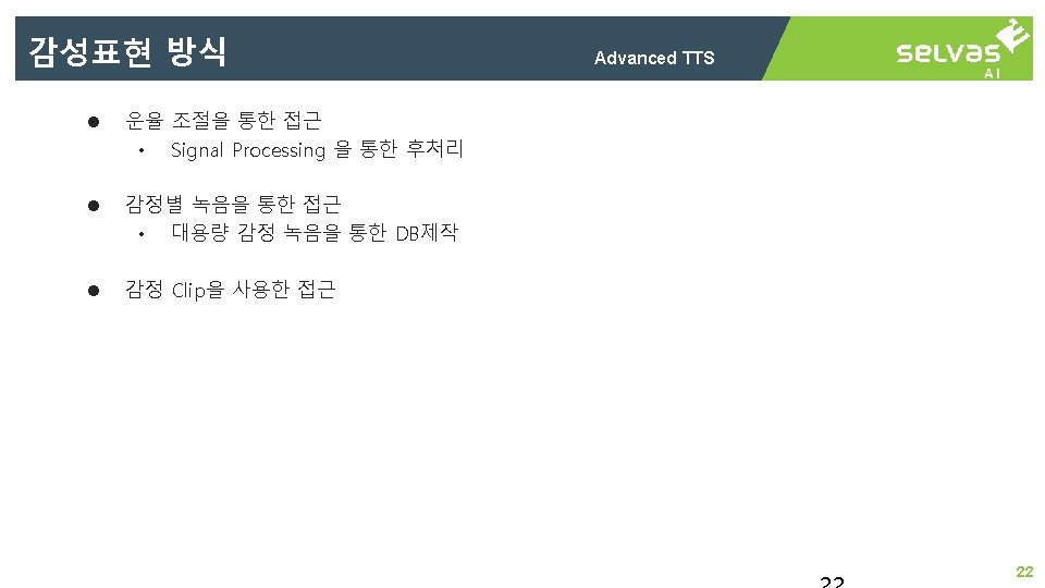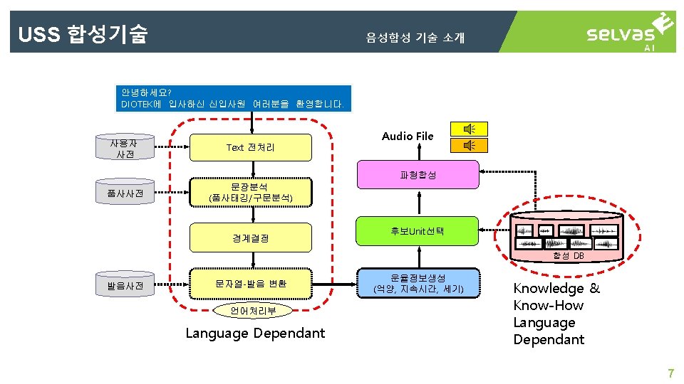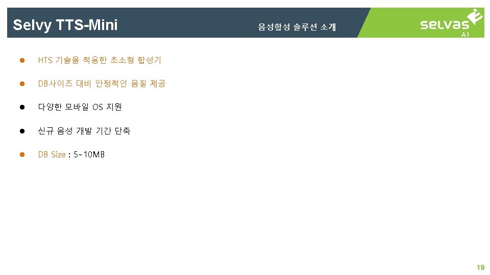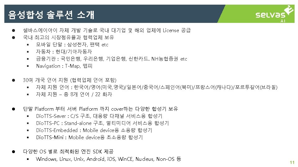 지원언어 음성합성 솔루션 소개 Swedish • • Sweden Finland Scanian Norwegian Danish Finnish Polish • Netherland • Belgian Catalan German Czech Italian French Dutch • • France Canadian Greek Turkish Arabic Russian Chinese • English Mandarin Korean Japanese • • United States United Kingdom Australian India Spanish • • North America Spain Portuguese • • Portugal Brazil 20