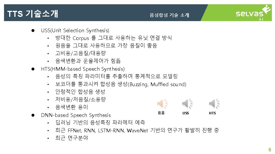 국내외 TTS 동향 음성합성 기술 소개 l 업체 • 국내 : ㈜디오텍, ㈜보이스웨어 • 국외 : Nuance, IVONA, Acapela, Cereproc, i. Flytek 등 l 기술 • USS : Unit Selection Speech Synthesis • • HTS : HMM Based Trainable Speech Synthesis • • Embedded 부터 Server 까지 다양한 사용 : 10 MB ~ 2 GB Embedded로 사용 (10 MB 미만) DNN TTS • 딥러닝 기반의 파라메터 예측 방식 5