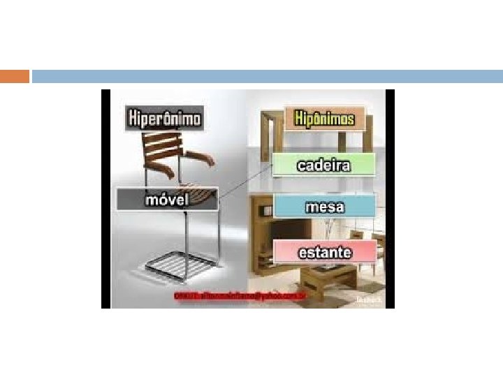Hipônimo Hipônimo: também tem origem grega hyponymon (hypo = debaixo, inferior/ onymon = nome), é a palavra com sentido específico, ou seja, com significado hierarquicamente mais específico do que as demais palavras. Laranja e morango são hipônimos de fruta. Vermelho e azul são hipônimos de cor. Brócolis e espinafre são hipônimos de verdura. Flores e jardins são hipônimos de flora. Gripe e resfriado são hipônimos de doença.