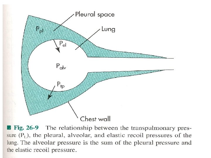 - Lung compliance – is measured with esophageal balloon (Ppl, pleural P), when the lung is not moving (no flow) Ppl is negative (subatmospheric). - Lung-chest interactions – Transmural P (across X), transpulmonary PL=PA-Ppl, the lung requires positive PL to increase volume. - Pw (transmural P across chest wall)=Ppl-Pb (barometric) - Prs (respiratory system)=PL+Pw=PA-Pb - Prs is 0 at FRC, at TLC both the lung and chest wall P are positive, both need transmural distending P.