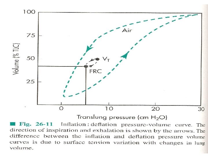 - VE=VTxf (6 L of air=500 m. Lx 12 breaths pm) - PA is 0 at no flow (any time during respiratory cycle), also for Prs (in the absence of airflow the Prs is 0). - DYNAMIC LUNG MECHANICS - Dynamic compliance – a dynamic CL ia calculated as a slope of the line that joints end-inspiratory and endexpiratory points of no flow. - Hysteresis of CL loop is related to lung volume dependent changes in surface tension. - Dyn CL is always less than sta at rest, but is increases during exercise (with larger Vt and P changes, more surfactant molecules are incorporated into air-liquid interface (sighing and yawning are normal physiological means to normalize surface layer). - Dyn and sta Cw are the same.