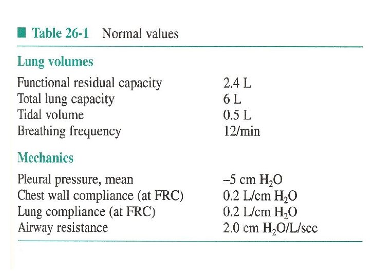 - Chest wall – rib cage, diaphragm, abdominal cavity, anterior abdominal muscles. - Static mechanics – not changing over time. - Lung Capacity – 2 or more volumes. - FRC – resting lung volume. - RV/TLC ratio – normal less than 0. 25, increased in air trapping (COPD) due to increased RV and TLC (RV more) (obstructive pulmonary disease) or in pulmonary fibrosis (restrictive pulmonary disease) due to TLC reduction